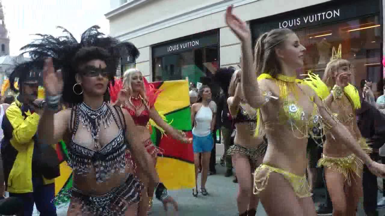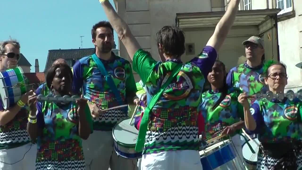 Carioca Samba have taget opstilling ved Christiansborg en lun sommerdag. Forbipasserende dansede med